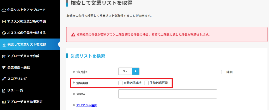 「検索して営業リストを取得」に送信実績という項目があります。