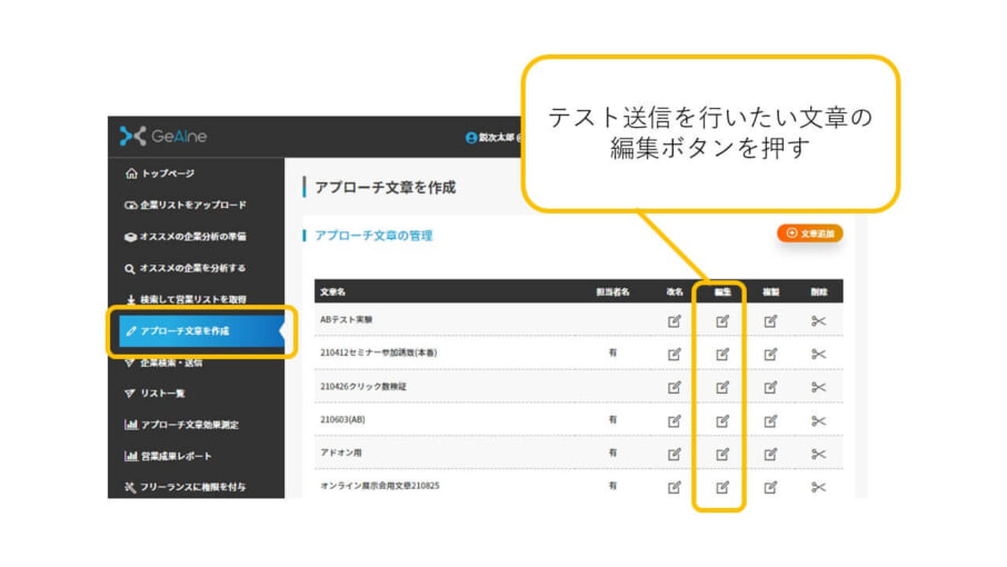テスト送信についてはアプローチ文章を作成ページから行うことができます。①左のアプローチ文章を作成タブを押下