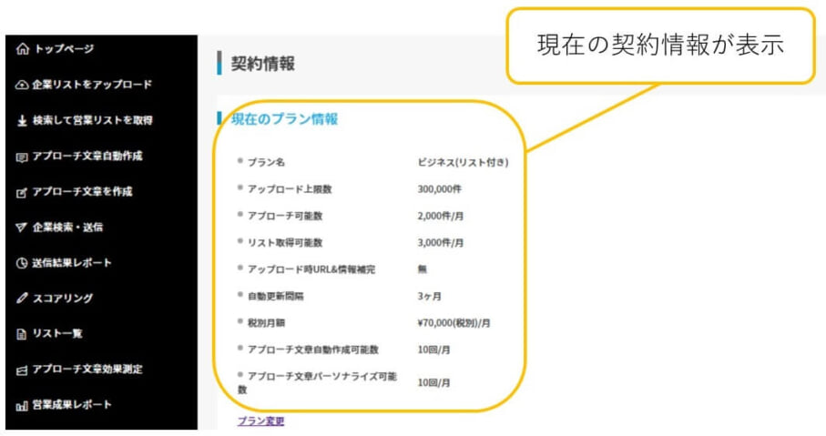 トップページ右上の「設定」にカーソルをあてると「契約情報」という項目が表示されますので、こちらをクリックします。