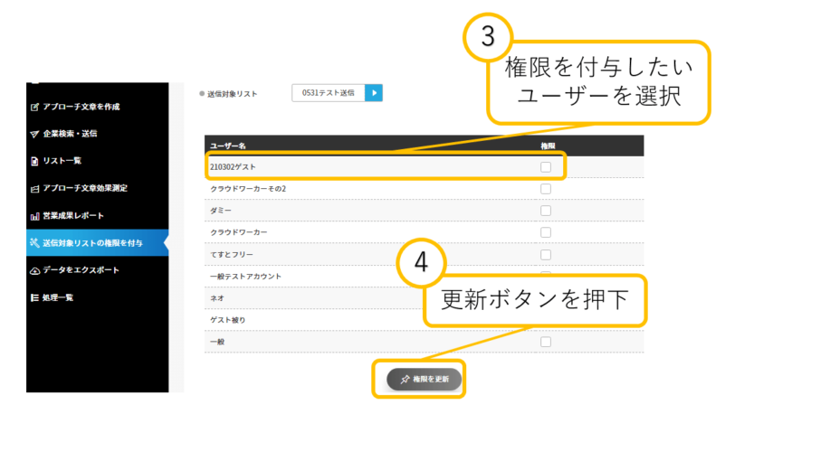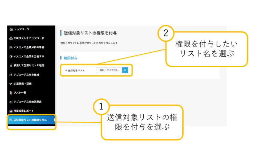 1:左タブより「送信対象リストの権限を付与」を選ぶ。