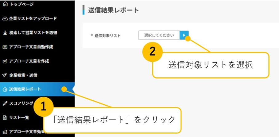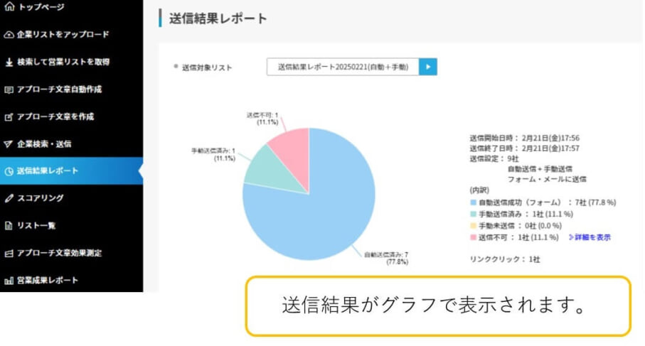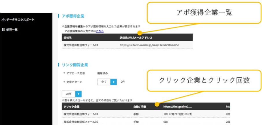 確認することができるのは主に以下3つの項目となります。 ・送信結果 ・アポ獲得企業一覧※アポ獲得をGeAIneに入力する必要があります。入力方法はこちら ・クリック企業一覧とURLごとのクリック回数