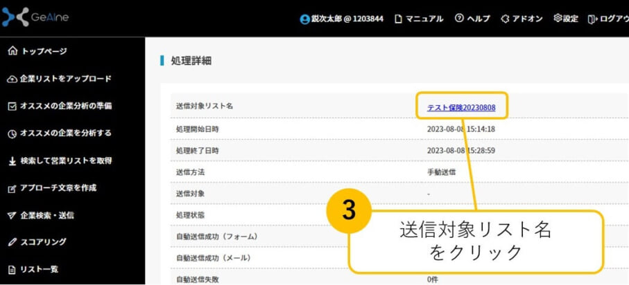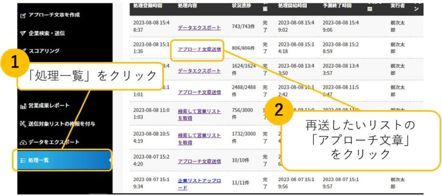 左タブの「処理一覧」のページから、再送を行いたい過去の送信処理を選択します。
