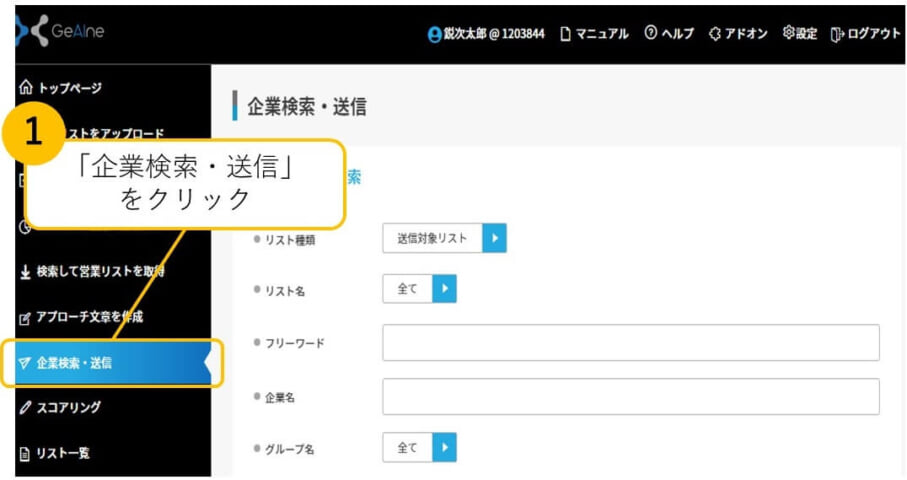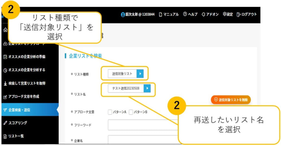 リスト種類は「送信対象リスト」を検索し、リスト名は過去送信を実施したリスト名の中で再送したいリスト名を選んだあと検索を実施します。