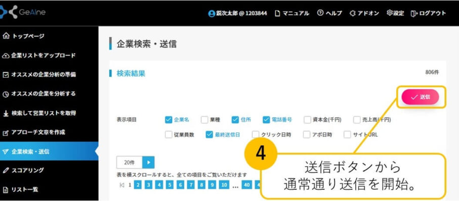 検索を実施すると、過去送信を実施した企業の一覧が表示されますので、送信処理を行って再送完了です。