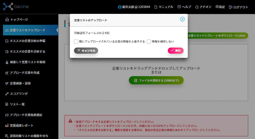 チェックをつけると、GeAIneに登録している企業と、リスト記載の企業で同一のものがあった場合、リスト記載の内容が上書きされます。