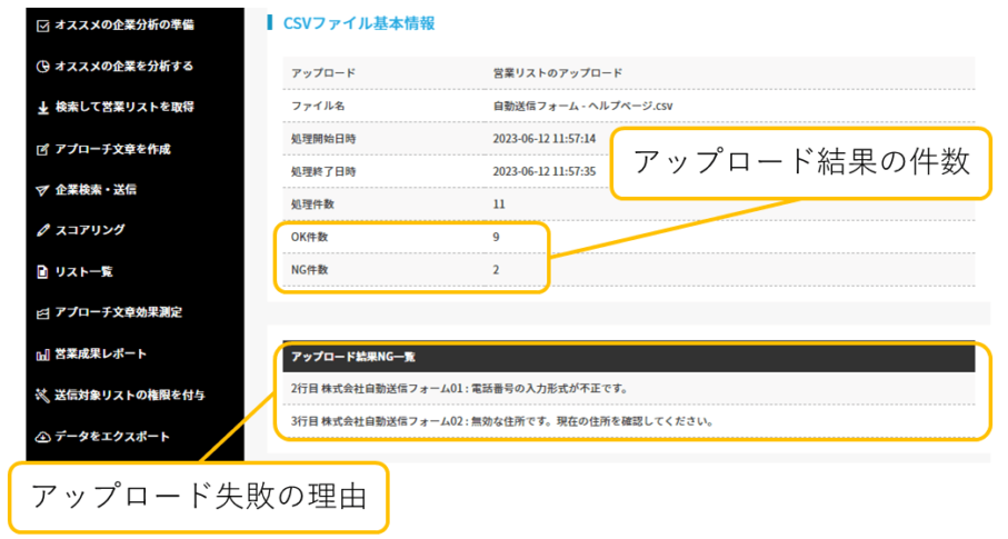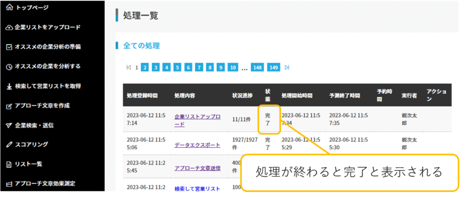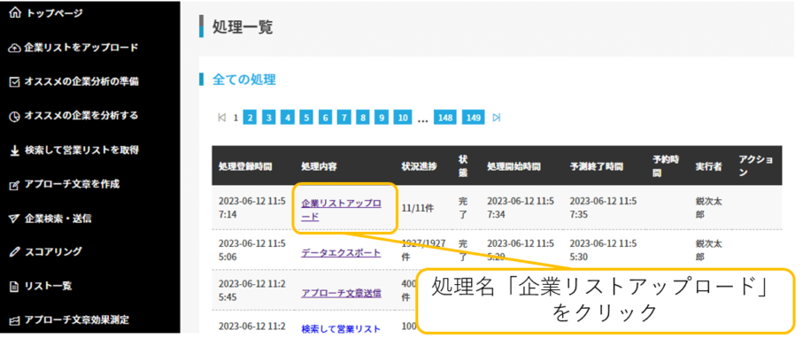 なお、アップロードが全て正常に完了できているか確認するためには処理内容の「企業リストアップロード」をクリックします。